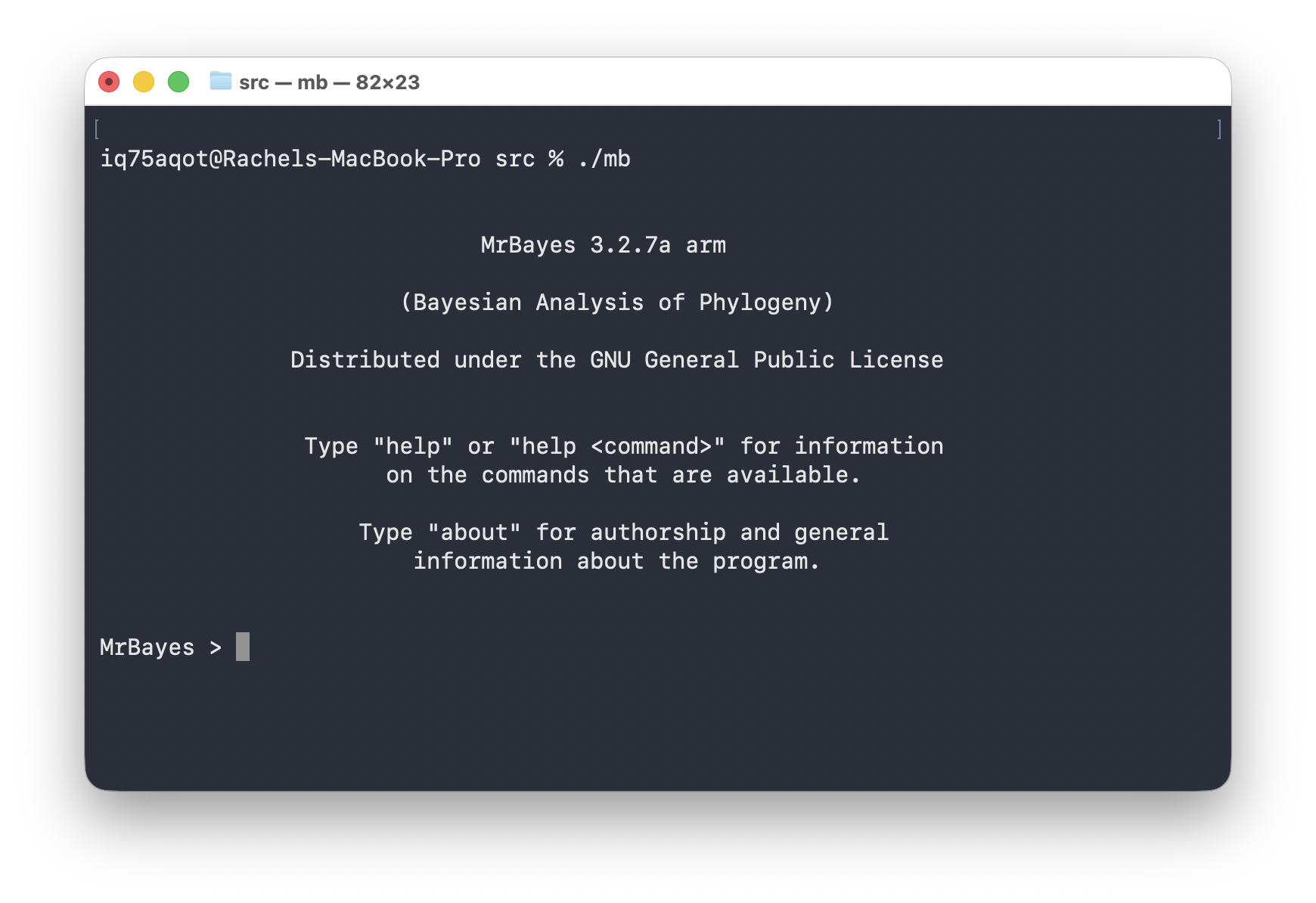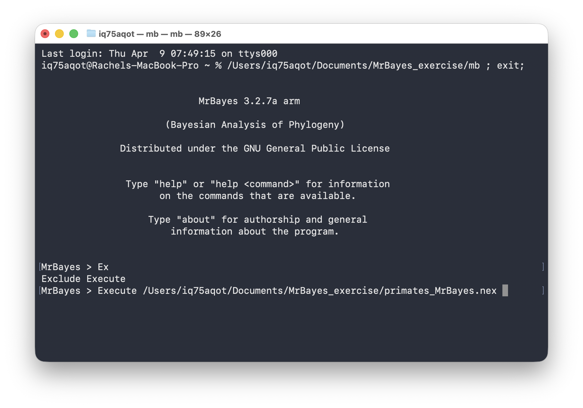 The easiest way to direct MrBayes to your file is to drag and drop your file into the MrBayes window. It should look something like this.