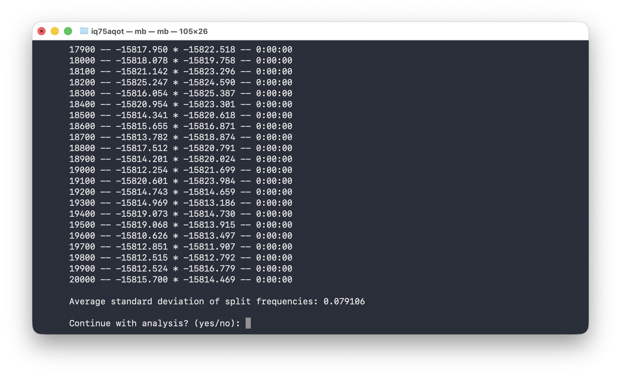 Go back to the MrBayes window and execute the file as above. If everything is working, the MCMC should initiate. After 20000 iterations it will ask if you want to continue.