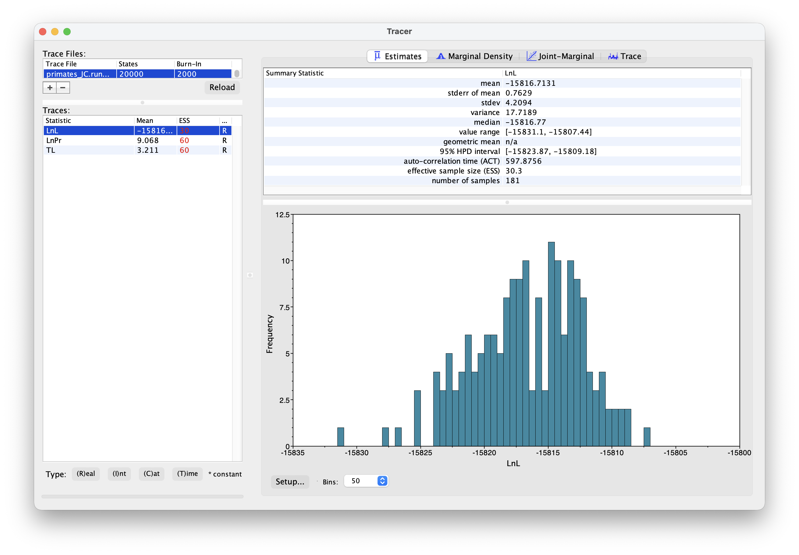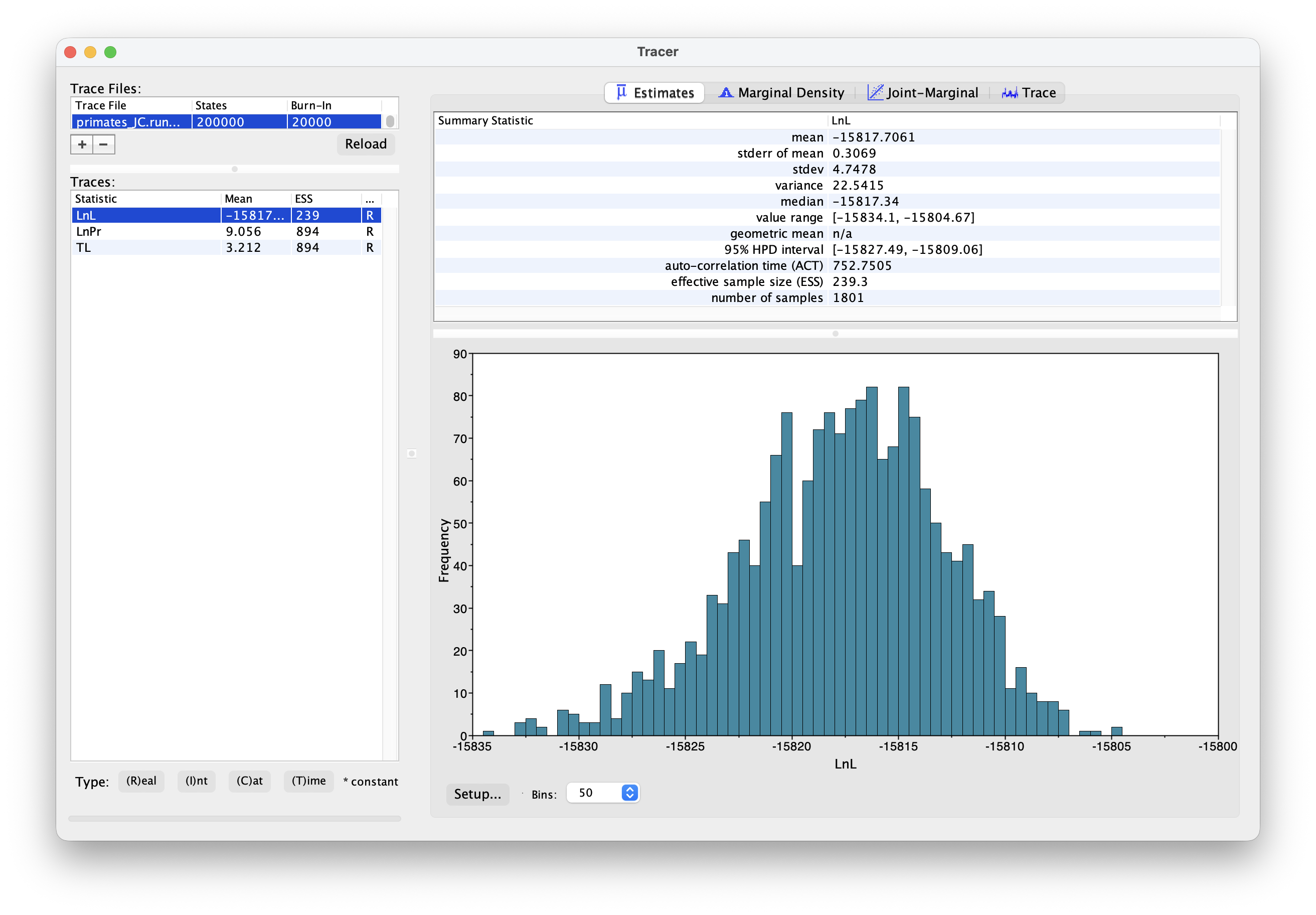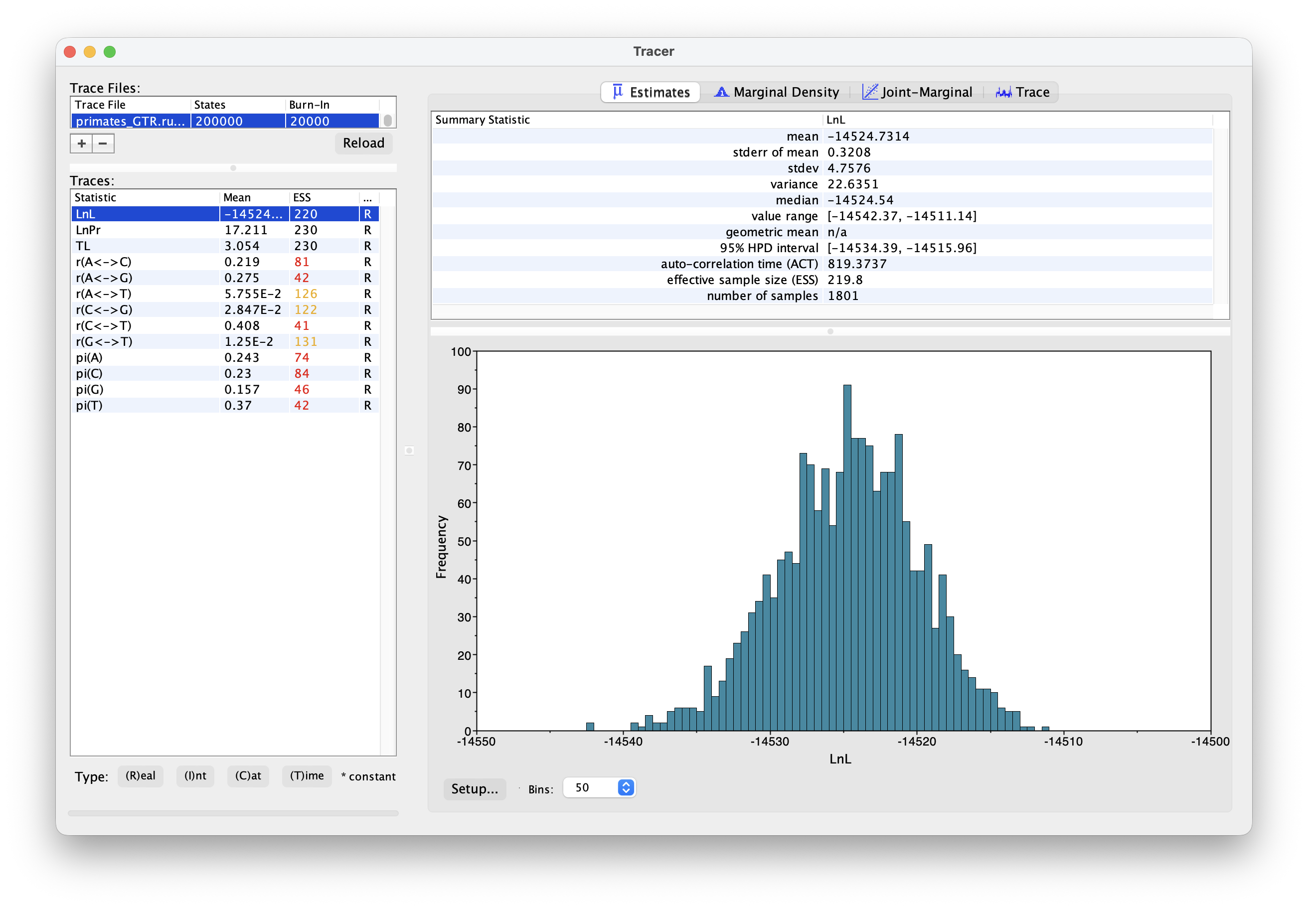 Let’s increase the chain length to 200000 and rerun the MCMC. This might take a bit longer \(-\) while you’re waiting for this to run, you could move on and set up the GTR substitution model.
