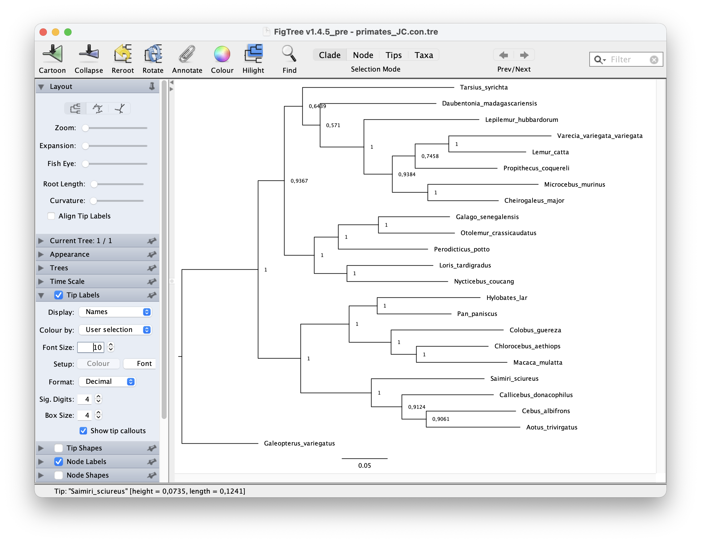 select the branch leading to "Galeopterus_variegatus \(-\) this is our outgroup, the flying lemur